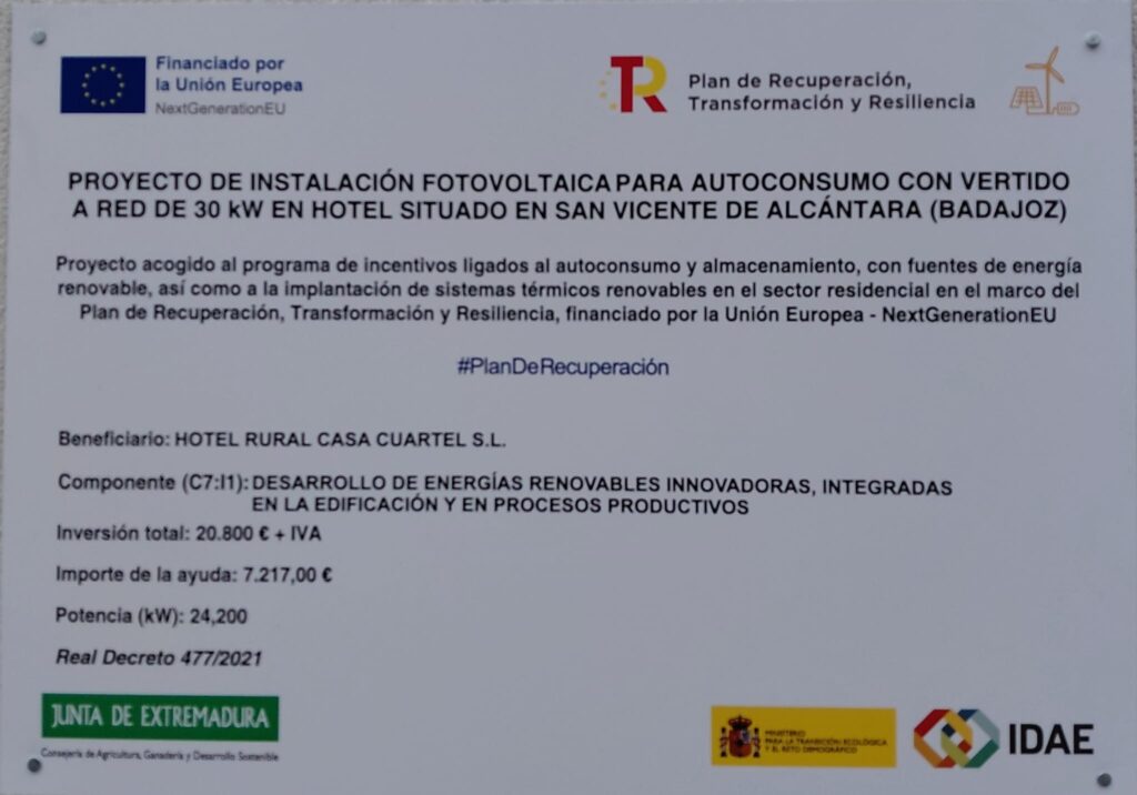 En Hotel Rural Casa Cuartel estamos firmemente comprometidos con la sostenibilidad y el respeto al medio ambiente. Por ello, hemos incorporado una instalación fotovoltaica de autoconsumo con vertido